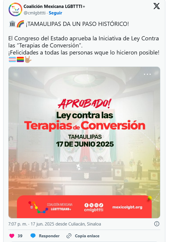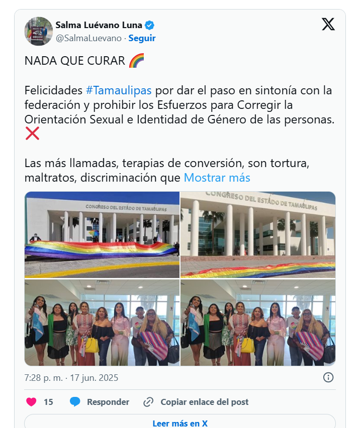 Esta decisión coloca a Tamaulipas entre los estados que reconocen legalmente que nadie debe ser forzado a cambiar lo que es. Las llamadas terapias de conversión han sido ampliamente rechazadas por organismos internacionales como la ONU, la OMS y la Comisión Interamericana de Derechos Humanos, por tratarse de prácticas sin base científica, que vulneran la integridad psicológica y emocional.