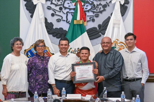 Con orgullo, entregó a nombre del Cabildo de Victoria reconocimiento a Gabriel Alejandro Avilés González, por su conquista de dos récords mundiales en 100 y 200 metros planos en el Abierto Europeo de Atletismo con Síndrome de Down celebrado en Praga, República Checa.