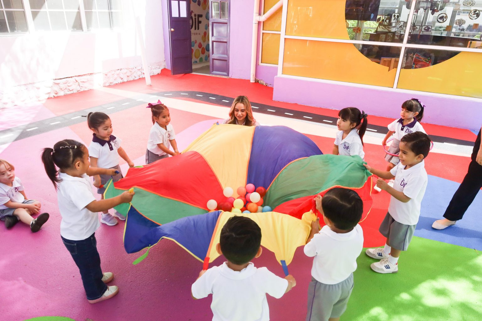 La presidenta del Sistema DIF Victoria, Lucy de Gattás, entregó un nuevo patio de juegos con superficie de tartán en beneficio de las niñas y niños que asisten a la guardería de la institución, reafirmando el compromiso de brindarles espacios seguros, alegres y propicios para su desarrollo.