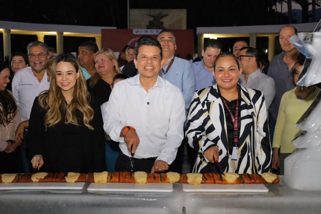 Con la participación de 300 familias y el talento gastronómico de jóvenes alumnos de la Universidad Vizcaya Victoria, el alcalde de Victoria Lalo Gattás y su esposa Lucy de Gattás, presidenta del DIF Municipal, degustaron la Monumental Rosca de Reyes.